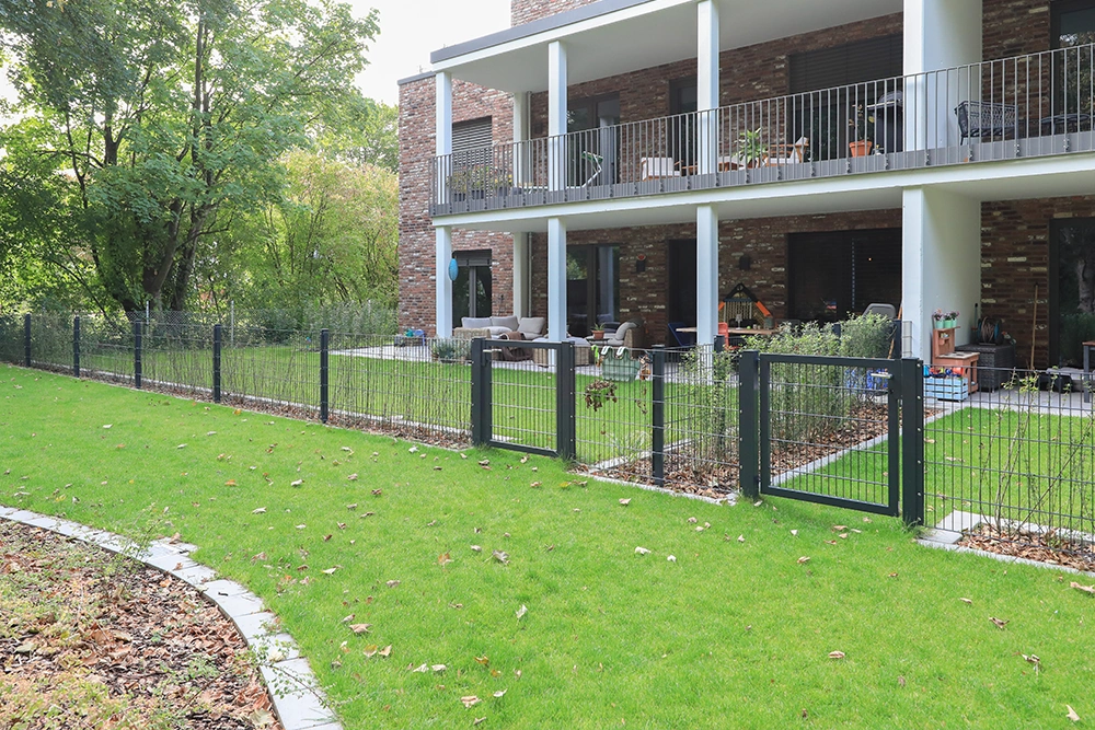 An der Bergstraße haben wir die Außenanlagen eines Mehrfamilienhauses geordnet: Einfahrt und Stellplätze sind klar strukturiert, der Eingangsbereich ist ruhig geführt und durch Pflanzflächen gefasst. Zur Gartenseite entstanden private Terrassen mit Rasen und Beeten; Zäune gliedern die Flächen, ohne die Offenheit zum Grün zu verlieren. Die Wege sind eindeutig, die Bepflanzung robust und pflegearm.